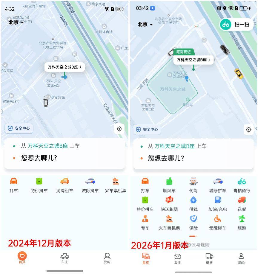 在出行领域,我们出门打车常用的滴滴出行,过去一年的变化也是脱胎换骨,从首页就能看出来,在 2024 年 12 月的版本中,首页只有打车、拼车、火车票机票等几个功能,而到 2026 年 1 月,功能就丰富很多了,顺风车、代驾、骑行、送货等等功能,满足了更多出行场景的需求。