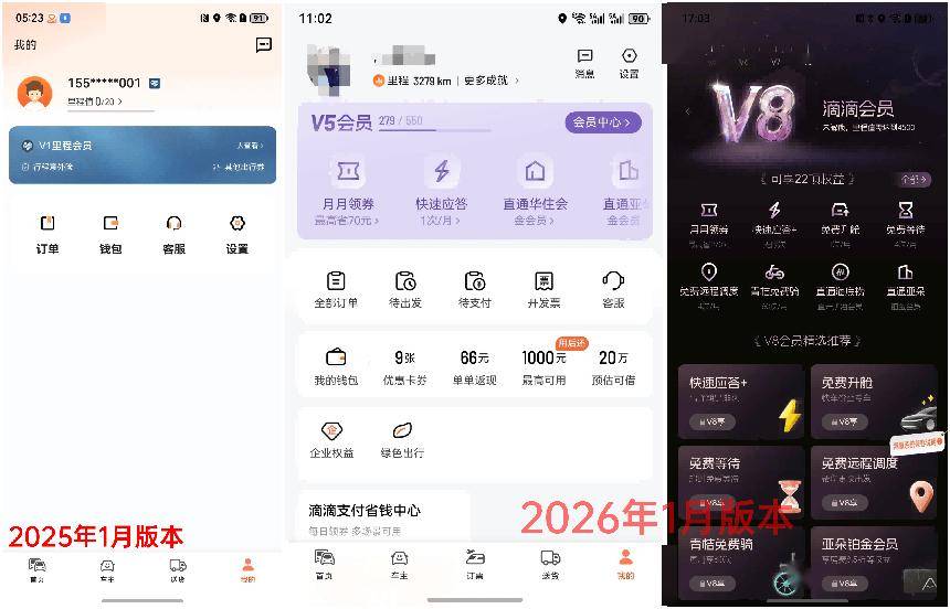 “我的”功能管理界面的变化,更是细致入微。2025 年 1 月的版本中,还只有订单、钱包、客服和设置几个基础的功能管理,而经过 1 年的开发,到 2026 年 1 月,这里已经增加了会员中心、发票、优惠券、省钱中心等丰富的功能,会员中心还增加了月月领券、快速应答、无车赔、华住会、亚朵、海底捞等多种会员权益,一站式满足用户各种需求。