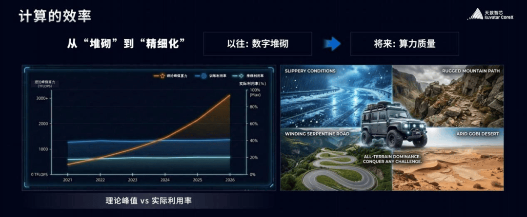 单纯堆峰值算力?纯属白费功夫,就像在泥泞山路里逼超跑飙极速,毫无意义!千行百业数字化转型,真正需要的是能翻山越岭、应对各种复杂场景的“全地形越野车”。而国产算力领军者天数智芯的这场发布会,直接亮出了破局答案 —— 不玩参数虚的,专解真实场景痛点,用全栈创新把算力拉回“高质量赛道”!