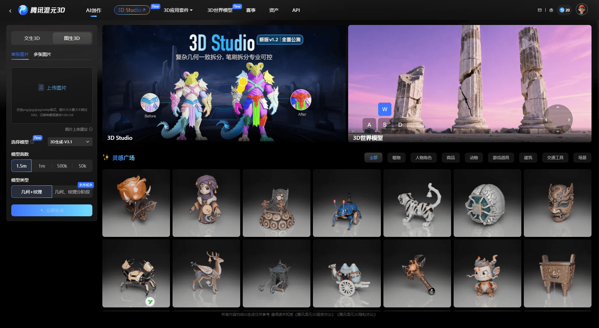 平台入口与应用场景腾讯混元已构建起完整的 3D 生产生态,从网页端创作到 API 集成,全方位赋能开发者与设计师。
