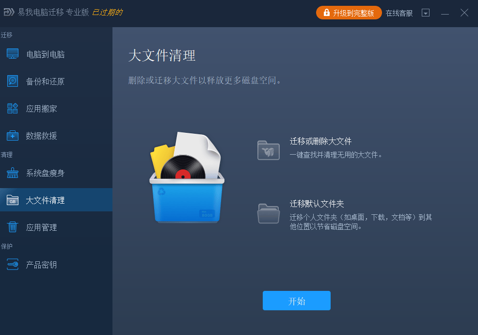 打开易我电脑迁移软件,选择“大文件清理”功能,点击“开始”;