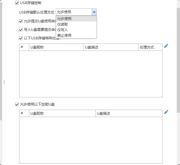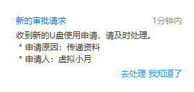 软件支持禁用U盘的同时,可以提交U盘使用申请,当员工确实需要用到U盘,可以提交使用申请,说明使用目的等信息。管理员可根据情况进行审批,审批通过后U盘方可使用。