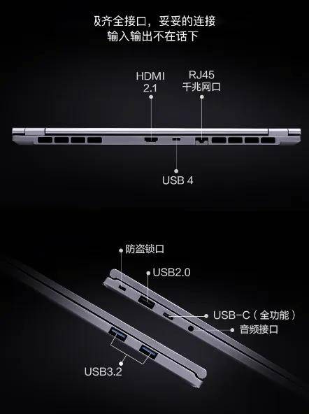 该机还配备 3 个 USB-A 接口(插 U 盘、键鼠够用)、2 个 USB-C、HDMI 2.1(外接高刷显示器)+ RJ45 网口(会议室稳定联网),内置 80Wh 大容量电池,并搭配有双天线 Wi-Fi 6 + 蓝牙连接。