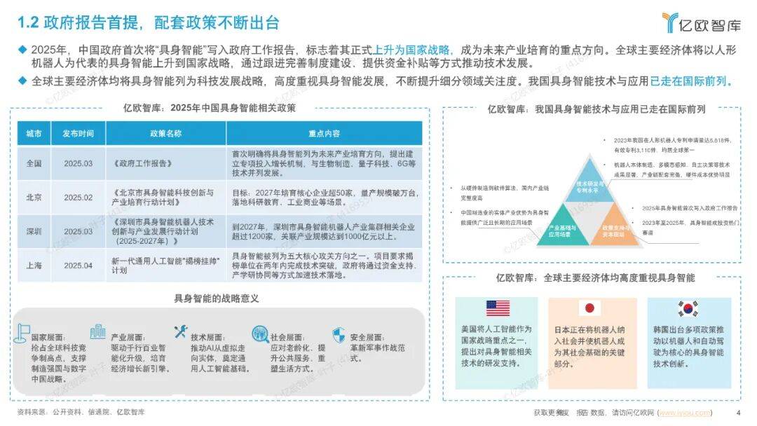 具身智能是一种基于物理身体进行感知和行动的智能系统,强调机器与环境的交互能力。人形机器人作为具身智能的典型代表,被视为实现具身智能的最佳载体之一。具身智能通过技术融合与产业升级,推动新质生产力的发展,实现劳动生产率的提升和产业结构的优化。2025年,中国政府首次将“具身智能”写入政府工作报告,标志着其正式上升为国家战略。全球主要经济体均将具身智能列为科技发展战略,高度重视其发展。