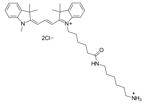 Cyanine3 amine 是一种含有游离氨基的官能花菁染料。 Cyanine3 是 Cy3® 的类似物。 该试剂的氨基可以与 NHS 酯、羧基(经碳二亚胺活化后)和环氧化物等反应基团共轭。 氨基染料以盐形式提供,并具有一定的水溶性。
