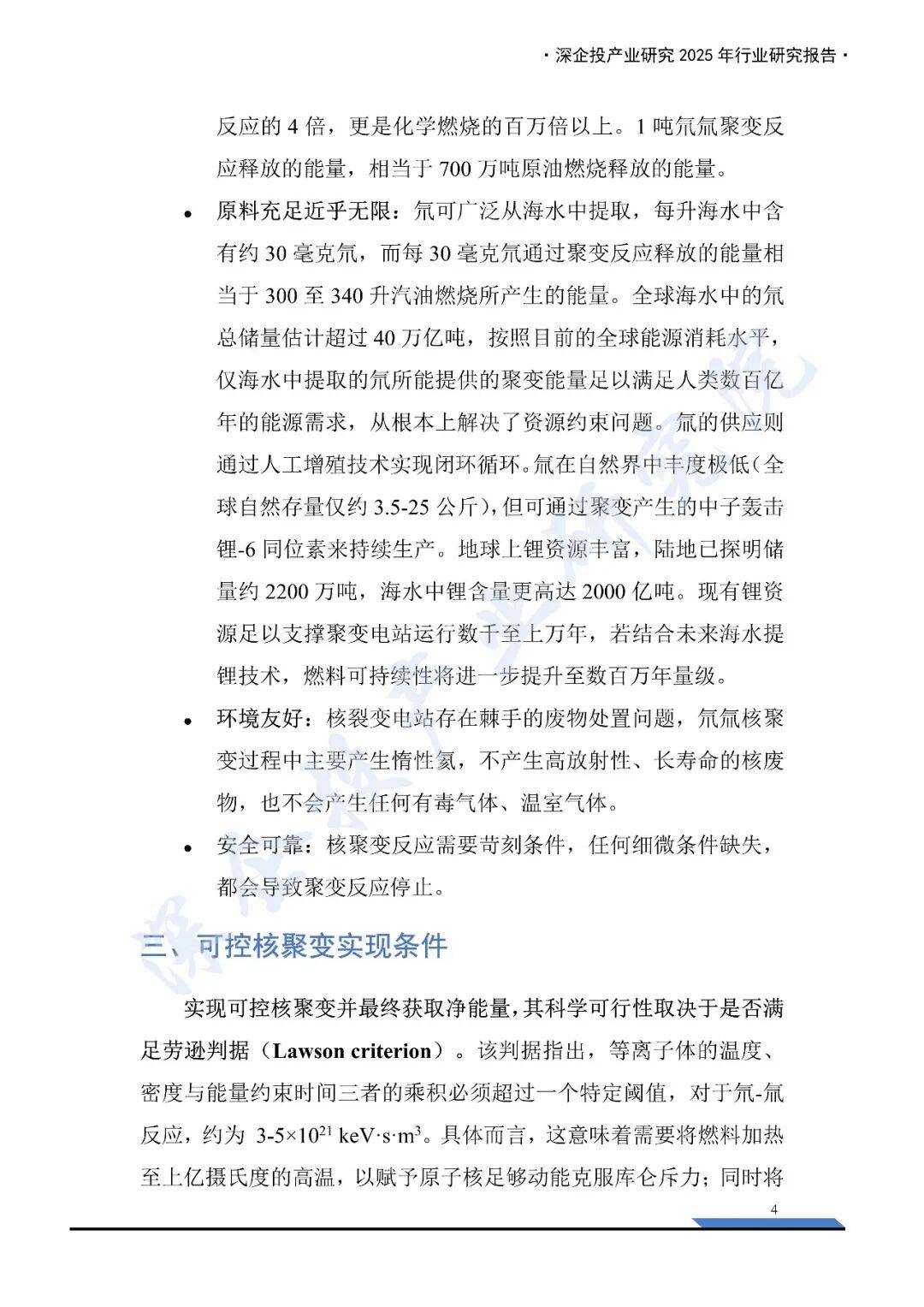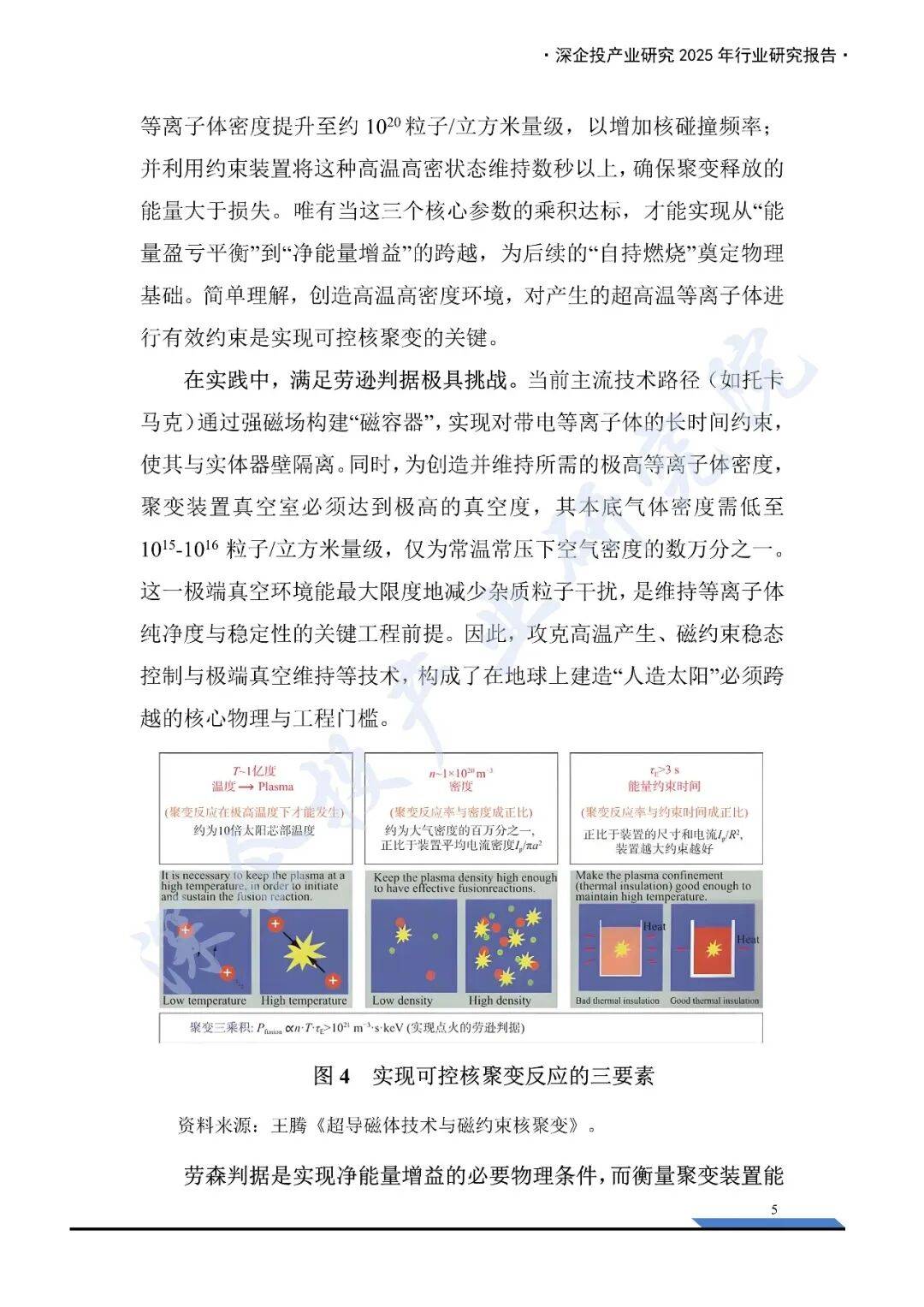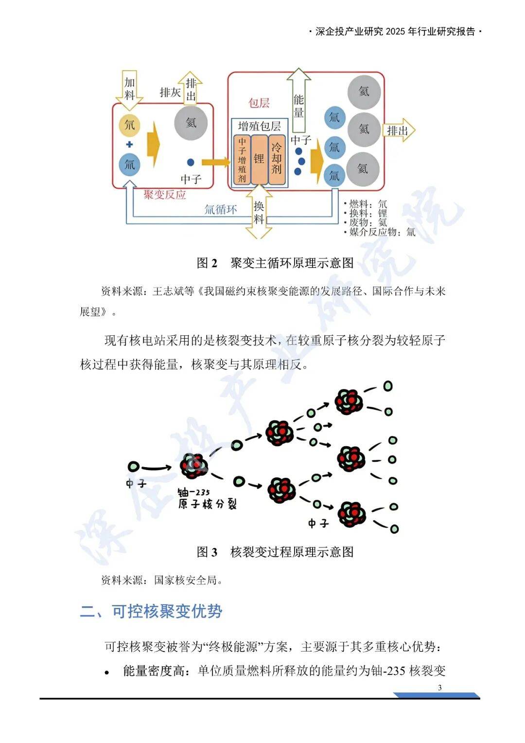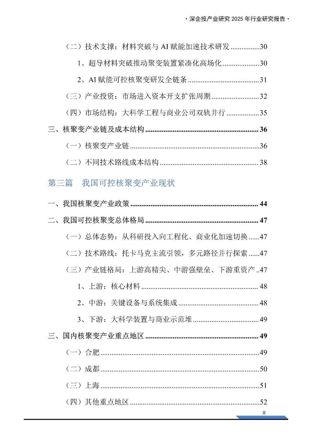 核聚变技术的发展离不开材料突破与人工智能的赋能。高温超导材料的突破推动了聚变装置的紧凑化与高场化,降低了能耗和运行成本;人工智能技术则在等离子体实时控制、实验数据处理、装置设计优化等方面发挥了重要作用,显著提升了研发效率和运行稳定性。核聚变产业链涵盖上游核心材料、中游关键设备与系统集成、下游装置运营与发电应用,不同技术路线的成本结构差异较大,托卡马克路线中磁体系统成本占比最高,而场反位形路线则以电源系统为核心成本部分。