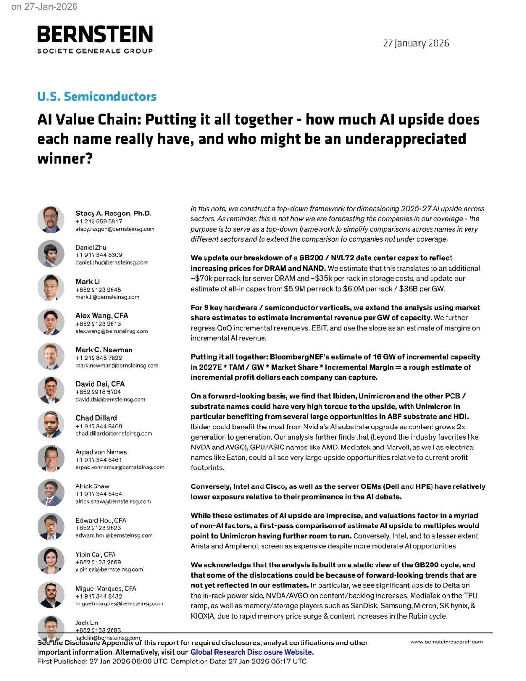 一、研究框架与目的这篇报告构建了一个自上而下的框架,用于量化2025-2027年人工智能在各硬件及半导体垂直领域的上行空间。需要明确的是,这并非作者覆盖公司的具体预测方法,而是作为一个简化比较工具,帮助投资者跨行业比较不同公司,并将比较范围延伸至非覆盖公司。该框架通过市场规模(TAM)每吉瓦(GW)成本、市场份额及增量利润率的乘积,估算各公司可捕获的增量利润。