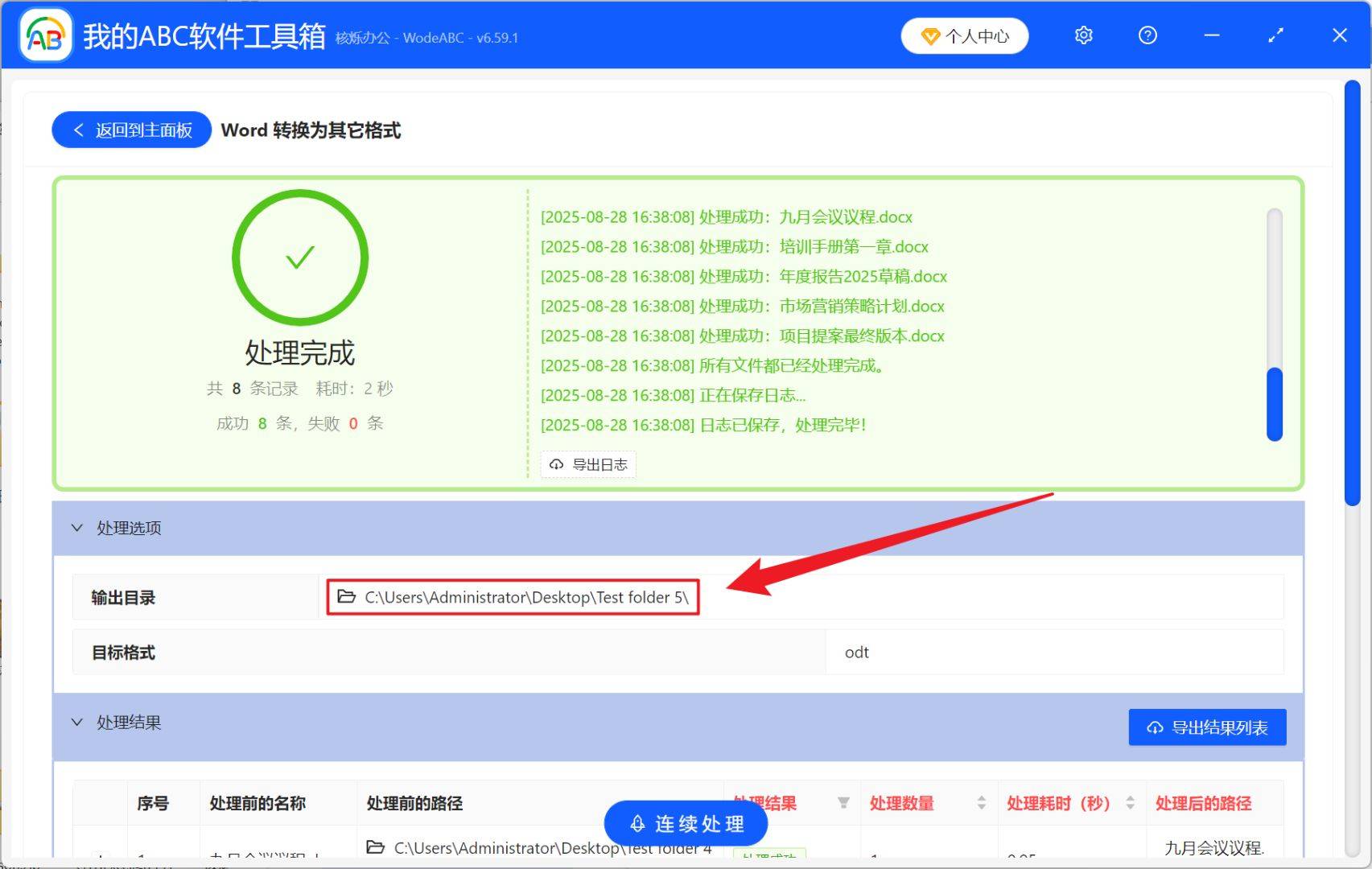 4、等待处理结束后,点击文件路径打开文件夹就能看到 Word 文档都成功转换为了 ODT 开源文件了。