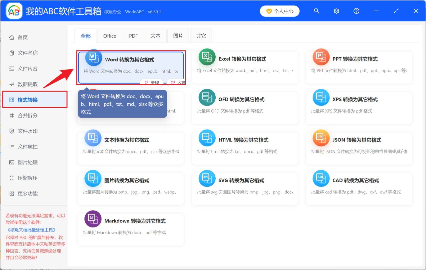 1、打开【我的 ABC 软件工具箱】,选择【格式转换】中的【Word 转换为其它格式】。