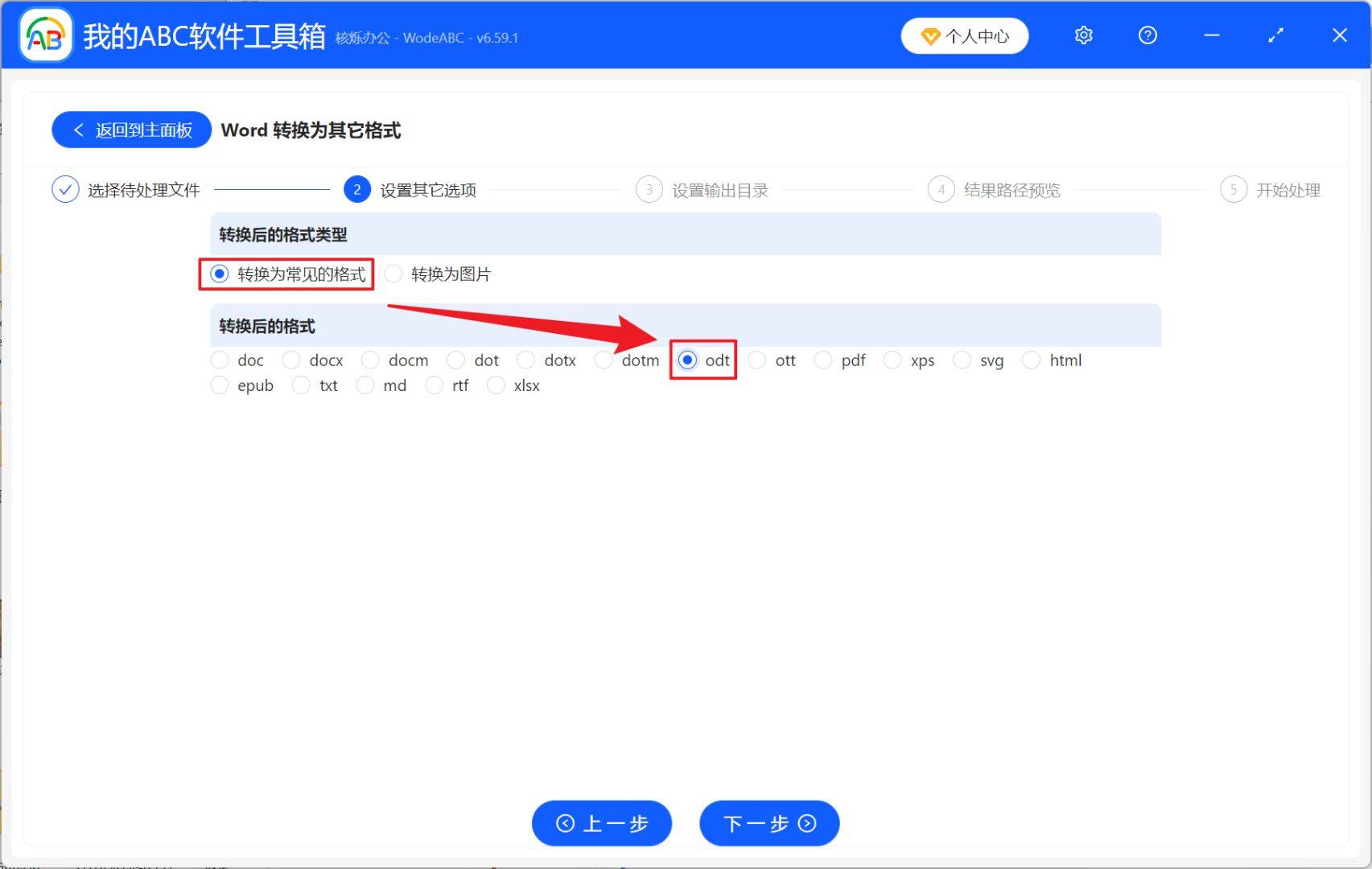 3、进入设置选项界面,选择转换为常见的格式,然后选择 odt,再次点击下一步。接着点击浏览,选择好新文件的保存位置。