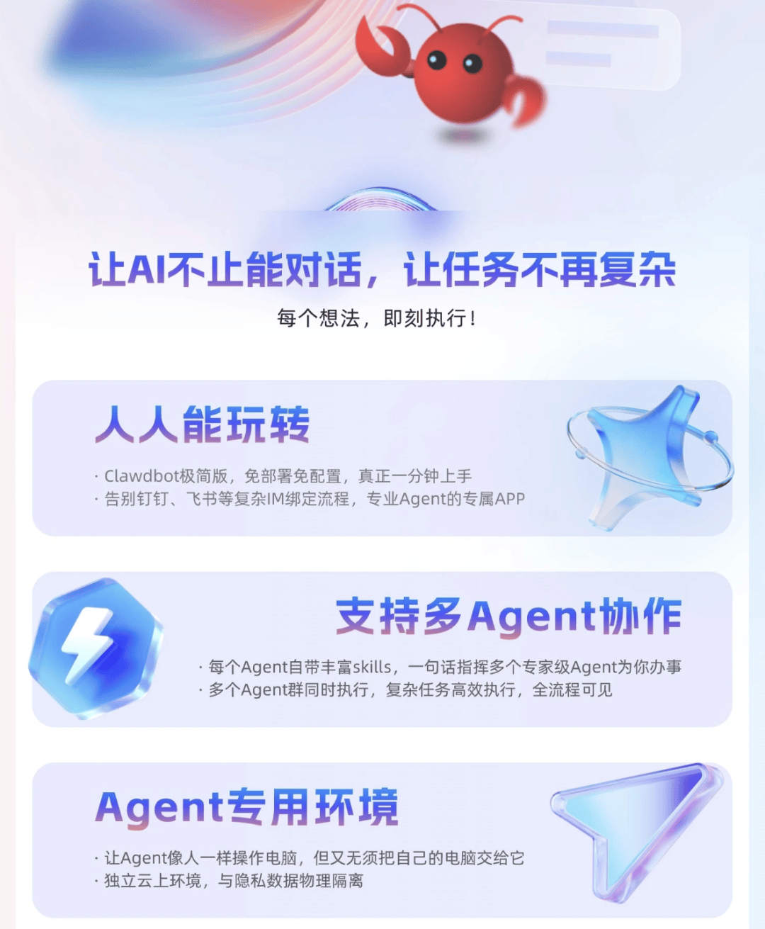 让人惊喜的是,阿里云已经推出了平替工具——无影JVS!它被官方描述为“首个clawbot多智能体协作平台”“人人能玩转的Clawbot极简版,免部署免配置,真正一分钟上手”。