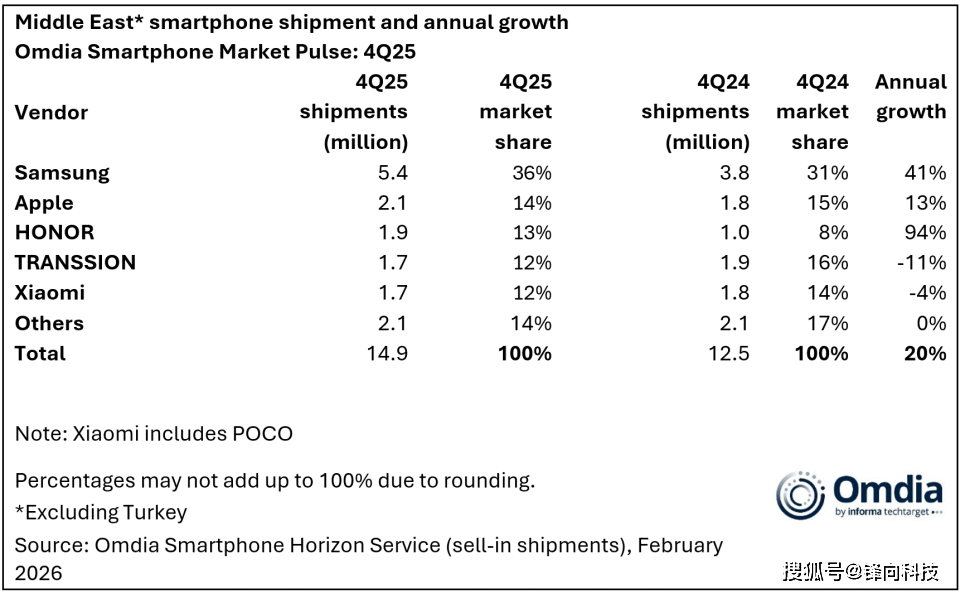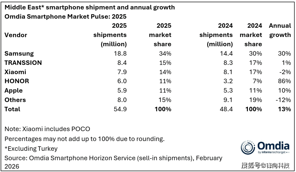 2月19日全球知名数据调研公司Omdia正式发布了,2025年第四季度以及全年中东(不包括土耳其)智能手机市场报告。这个市场的数据非常亮眼,国产品牌表现相当棒。