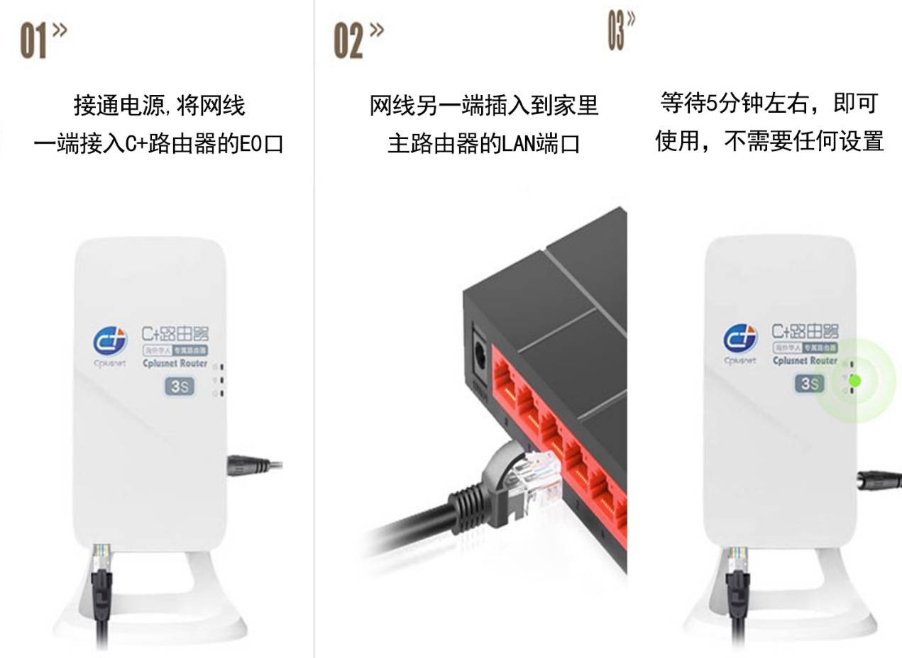 在实际使用过程中,C + 路由器采用即插即用的便捷设计,用户无需进行任何网络设置。仅需将 C + 路由器接通电源,并通过网线连接至海外家庭网络中的路由器或调制解调器(Modem)后端就可以用了,非常方便。