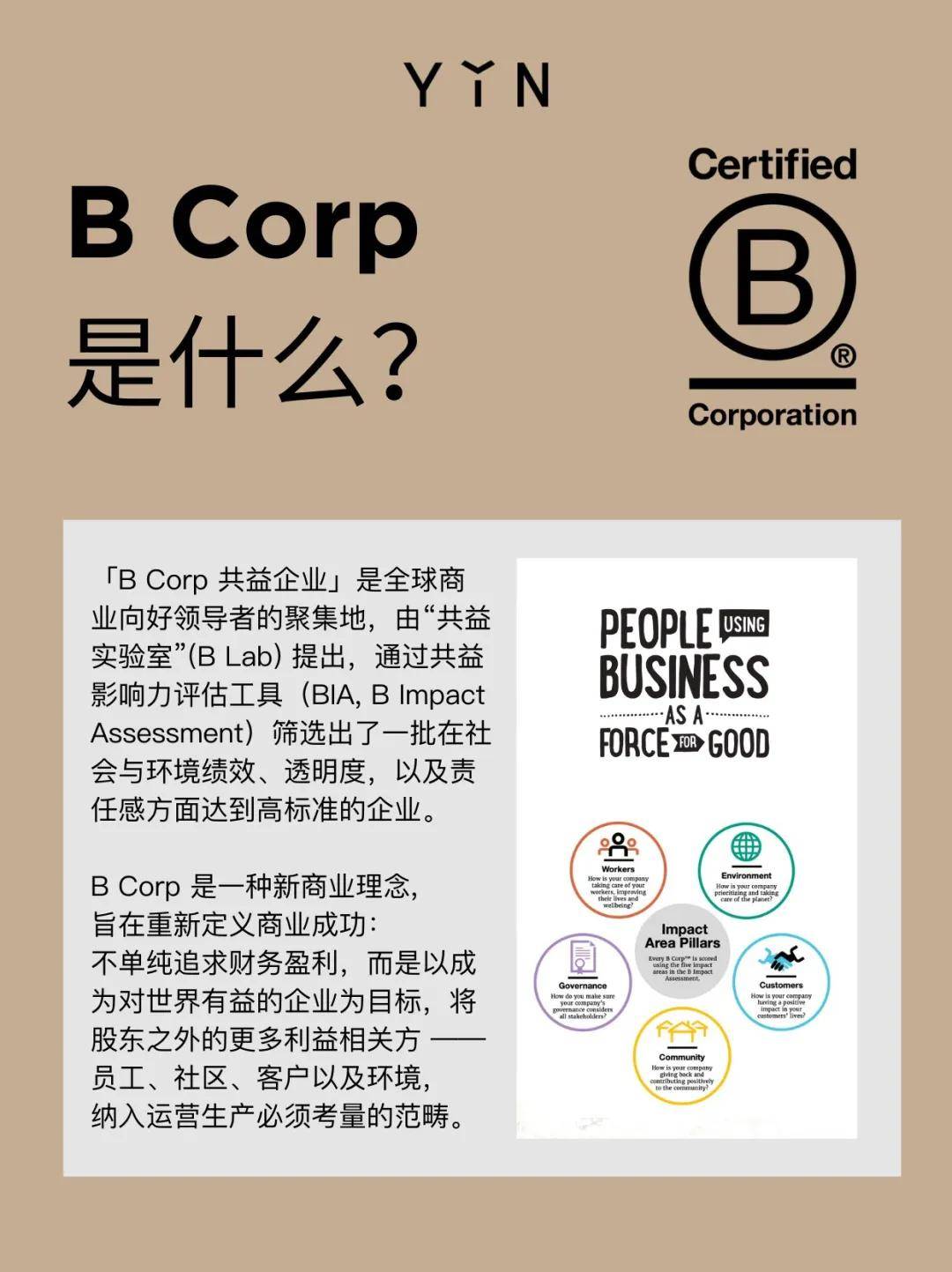 B Corp认证涵盖环境、员工、社区、客户、governance(治理)五个维度,要求企业在商业运营中兼顾社会价值与环境责任。