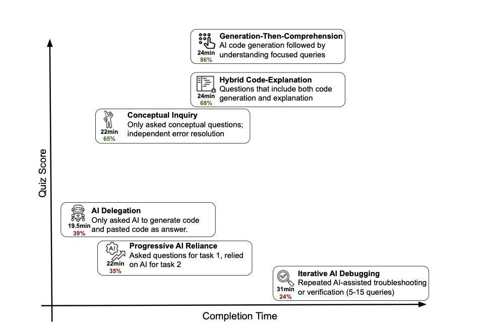 甩手掌柜型 (AI Delegation):直接把题目复制给 AI,「帮我写个函数解决这个问题」,然后 Ctrl+C / Ctrl+V,直接交卷。他们任务完成速度确实最快(平均 19.5 分钟),但学到的东西几乎为零,我奶奶来做都能行。