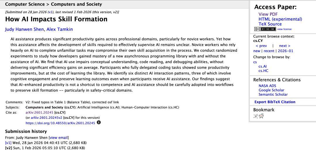 他们发了一篇题为《AI 如何影响技能形成》的硬核论文,告诉我们一个残酷的真相:如果你在学习新东西时过度依赖 AI,你不仅不会变快,你的核心能力还会出现显著退化。