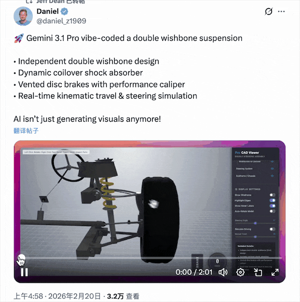 有人用Gemini 3.1 Pro 生成了一个可交互的 3D 机械级汽车悬架系统模拟器,包含真实几何结构、连杆约束与实时转向和行程计算,相当于把机械工程建模、物理逻辑和3D可视化一次性写成可运行工具,接近工程级原型能力。