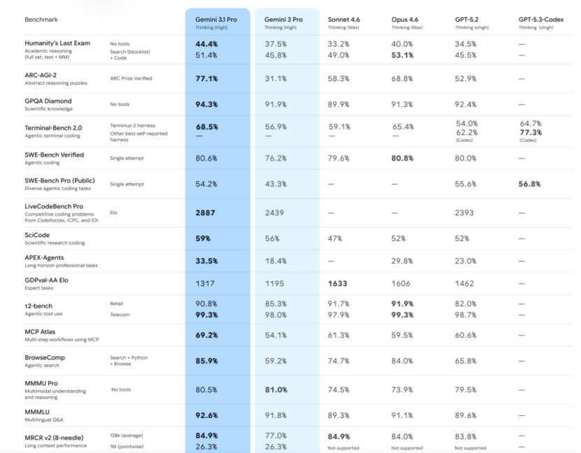 在ARC-AGI-2基准测试中,3.1 Pro的验证得分达到了77.1%。比3 Pro的推理性能提升了一倍以上。