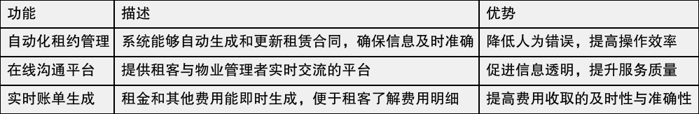 智能园区物业管理软件的租客管理创新功能分析智能园区物业管理软件在租客管理方面引入了多项创新功能。这些功能包括自动化的租约管理、在线沟通平台和实时账单生成。通过这样的设计,物业管理者能够更轻松地处理租客入驻和退场手续,减少人力成本。下表展示了这些创新功能的具体内容和优势: