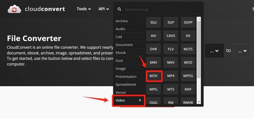 2、选择网站内支持的视频类型,可以看到其中包括“mov”格式。