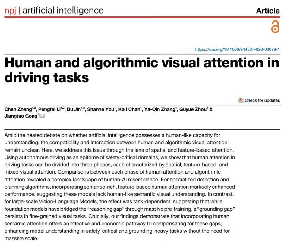 IT之家2 月 21 日消息,清华大学智能产业研究院(AIR)今日宣布,其团队在自然子刊《npj Artificial Intelligence》上发表研究,揭示了人类与智驾算法视觉注意力的本质差异。