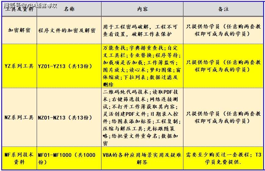 我给VBA的定义:VBA是个人小型自动化处理的有效工具。利用好了,可以大大提高自己的工作效率,而且可以提高数据的准确度。“VBA语言専攻”提供的教程一共九套,分为初级、中级、高级三大部分,教程是对VBA的系统讲解,从简单的入门、到入门后的提高、到数据库、到字典、到Word VBA的应用、到高级网抓及类的应用、一直讲到程序的分发。另外,为了方便大家在写代码是方便查找,“VBA语言専攻”又推出了一部VBA汉英手册,这部手册覆盖了VBA的方方面面,与实际工作衔接度高。为了更好的完善学员的知识结构,丰富学员的实践经验,“VBA语言専攻”还提供给学员VBA工具,有较复杂些的NZ系列工具,较容易些的YZ系列,这个两个工具系列一共是二十六份。