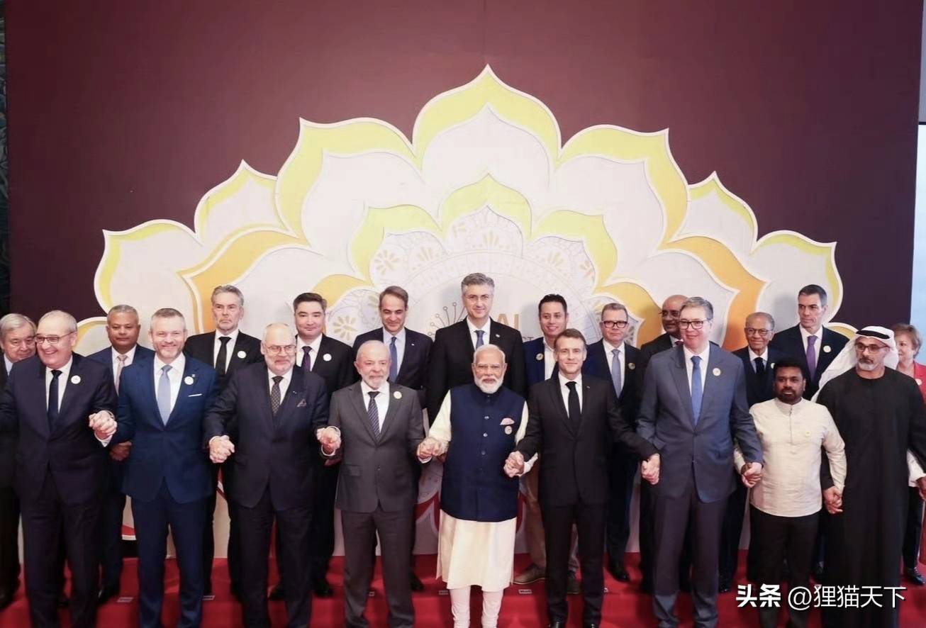 在峰会的合影环节,来宾数量不少,但重量级人物却寥寥可数。一眼望去,最为熟悉的面孔大概只有四位:entity[entity[、entity[·马克龙历山大·武契奇站在中间,左手挨着马克龙,右手靠着卢拉,显然是精心安排的主角位置,展示出印度的主场荣耀,也凸显出这次峰会的核心——莫迪的个人秀。
