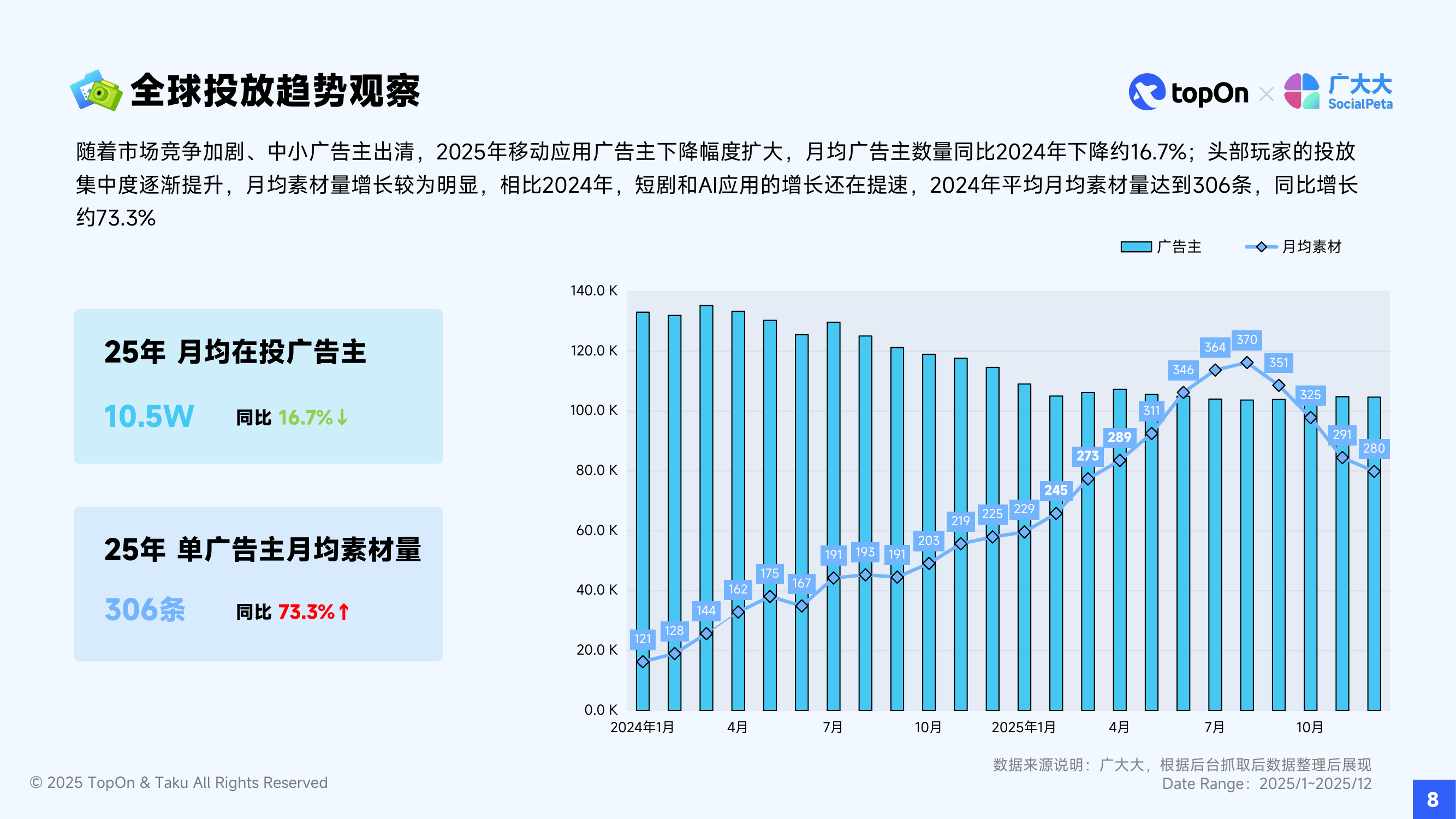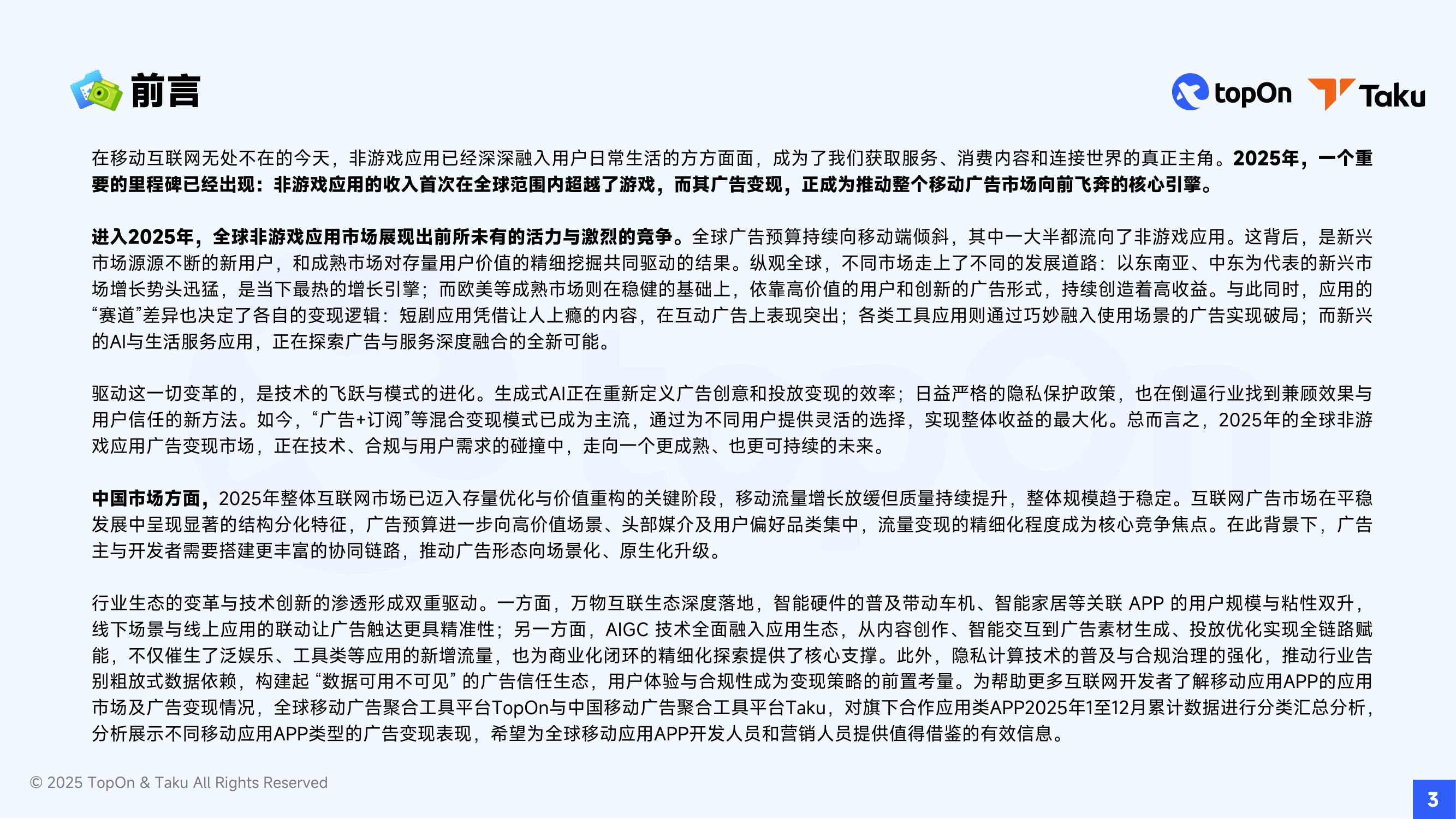 2025年,全球非游戏应用市场迎来关键转折点,其广告收入首次超越游戏应用,成为移动广告市场的核心驱动力。这一趋势背后,是全球广告预算持续向移动端倾斜,尤其是新兴市场新用户的不断增长与成熟市场对用户价值的深度挖掘共同推动。
