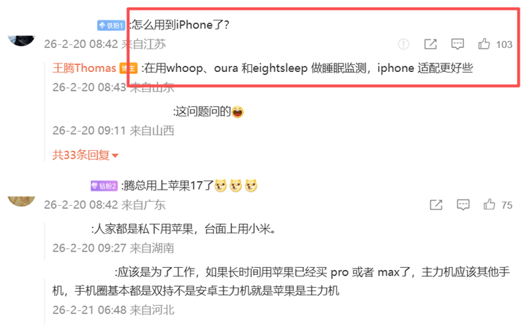 没想到这个不起眼的小操作,引起了网友的关注,有网友提问:怎么用到iPhone了?王腾回应:在用whoop、oura 和eightsleep 做睡眠监测,iPhone 适配更好些。