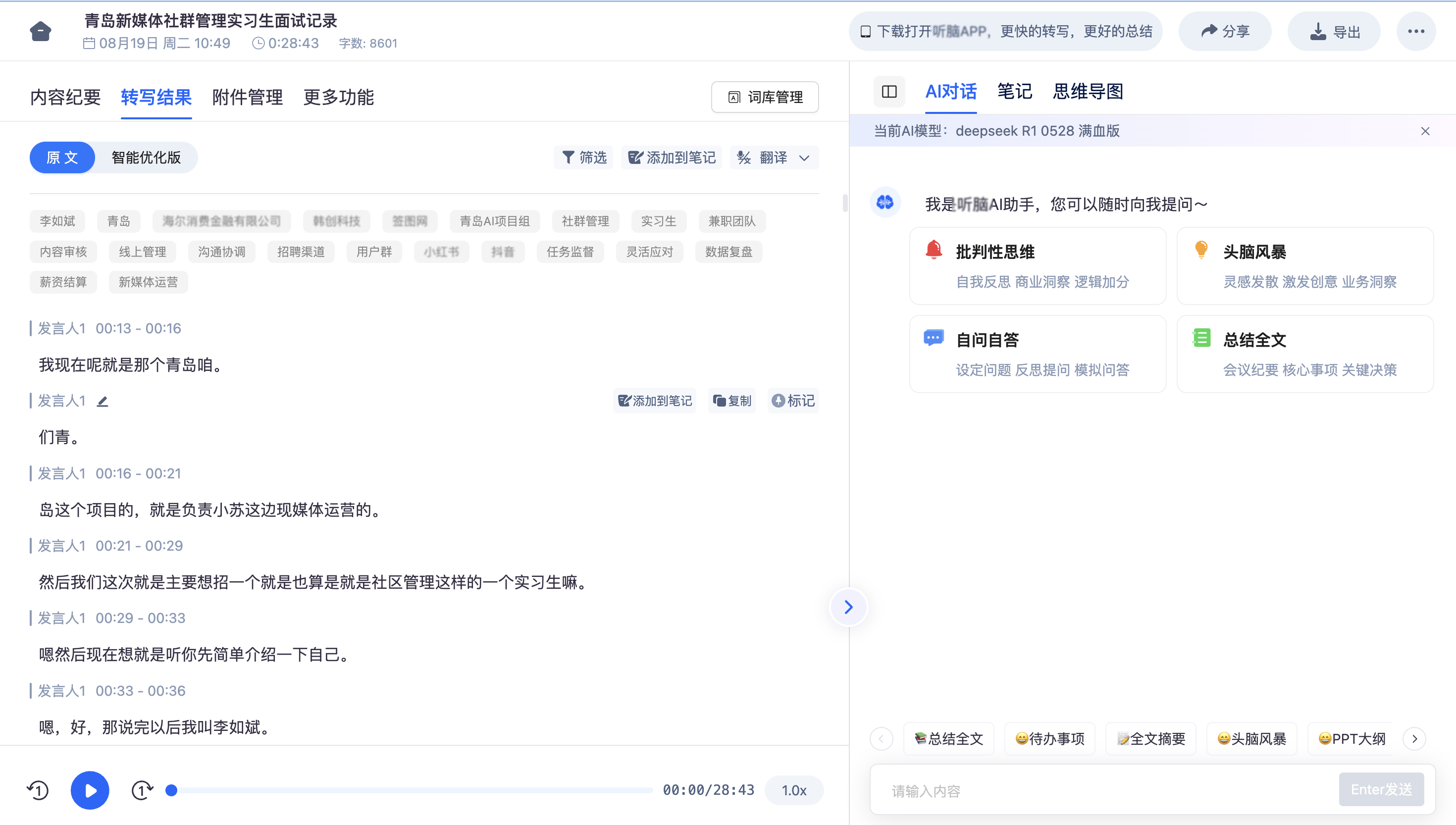 - 场景模式:转写前根据内容选择对应模式,如“职场话题”“美食探店”“学术讲座”,AI会根据场景调整分析逻辑。
