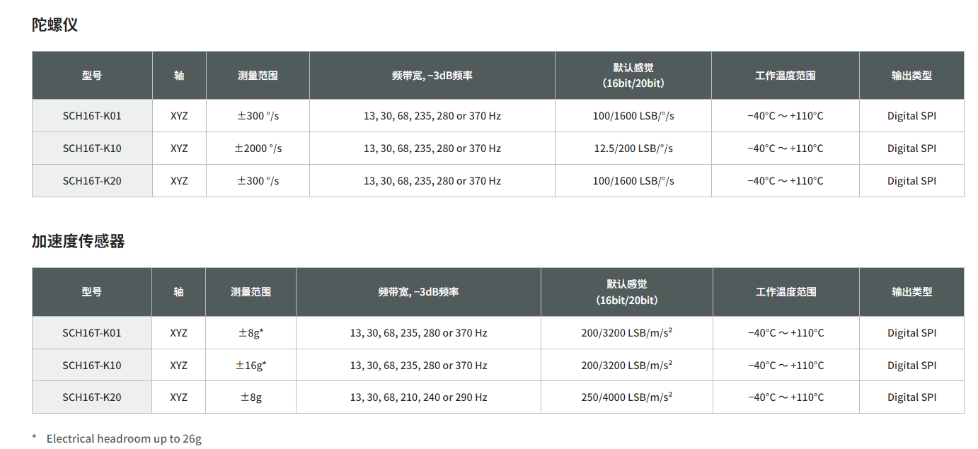 辅助数字加速度计通道,动态范围高至±26g(仅限SCH16T-K10和SCH16T-K01)
