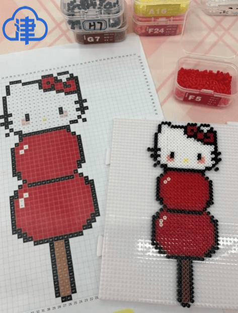 “人多后发现,大家百分之八十是冲着拼豆来的”,张艾霖说,“现在拼豆很流行,就是把五颜六色的塑料小豆子,在带孔模板上拼组成图案后,经熨烫定型,形成马赛克像素画,可以做成挂件,也可以做成冰箱贴。这种手工价格不高,一两个小时的制作过程很解压,现在不仅小孩子喜欢,年轻人也把制作它,当作放空身心的治愈方式,就像当代版十字绣。”