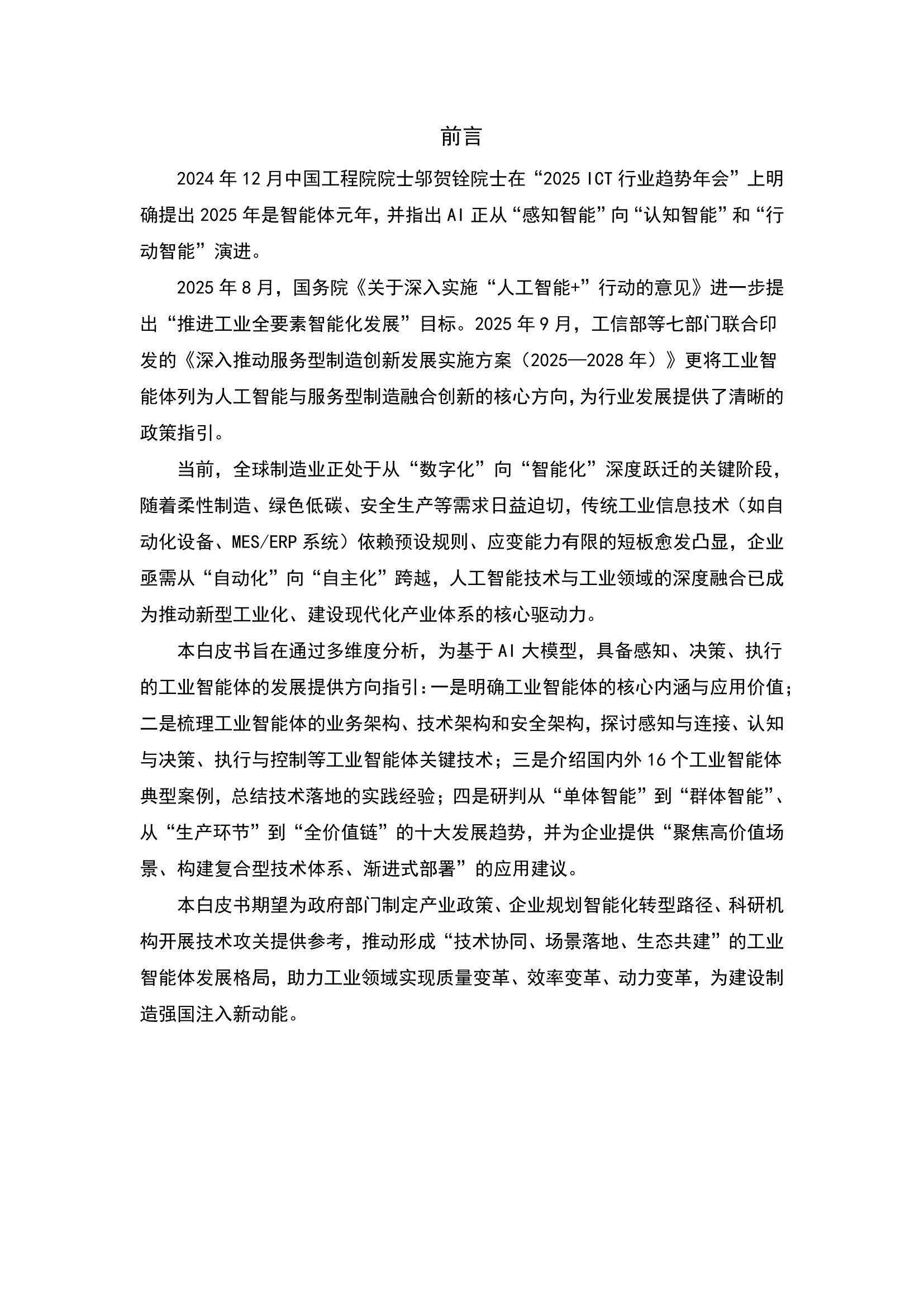 报告还选取了国内外16个典型应用案例,涵盖制造、运维、管理等多个领域,总结实践经验,为后续发展提供参考。研判未来从“单体智能”向“群体智能”、从“生产环节”向“全价值链”演进的十大趋势,建议企业聚焦高价值场景,构建复合型技术体系,采取渐进式部署策略。