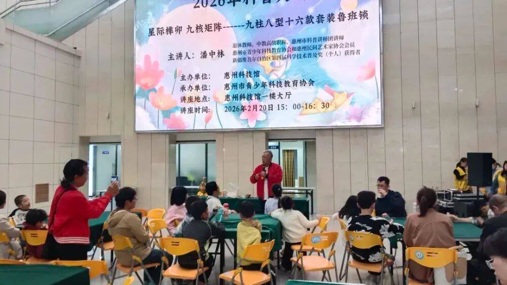 2月20日下午,由惠州科技馆主办,惠州市青少年科技教育协会承办的“星际榫卯九核矩阵----九柱八型十六款套装鲁班锁”主题科普讲座在惠州科技馆一楼大厅顺利举行。本次活动共吸引30多组亲子家庭、市民、志愿者等近70多人参加。