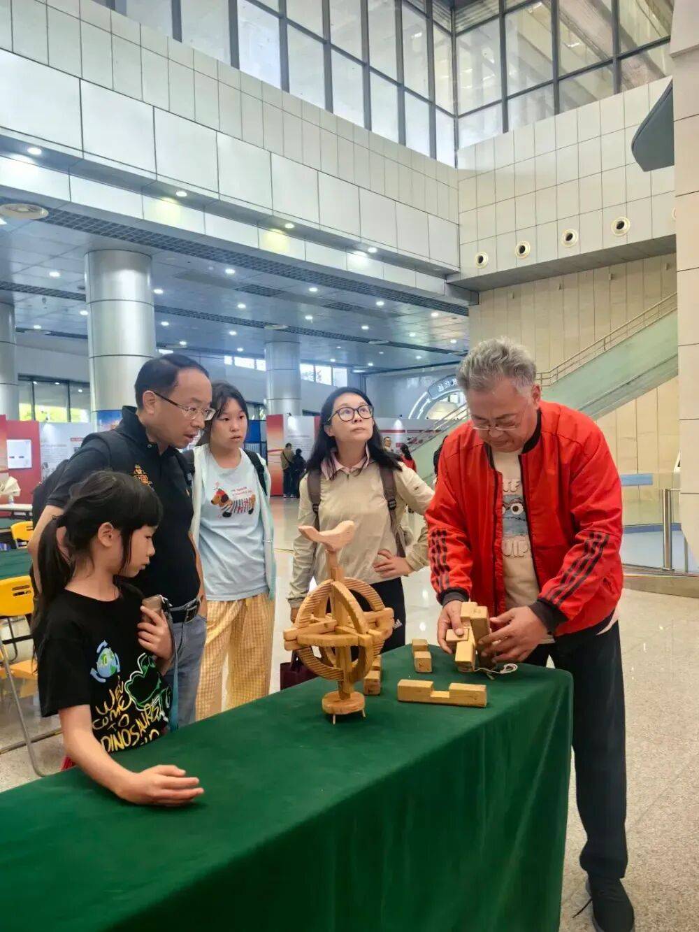 在备受期待的动手体验环节,潘老师表示把玩鲁班锁可以提高空间想象和对几何图形的辩识能力,同时结合九柱八型十六款鲁班锁等互动教具,通过讲解+演示+拼装体验,让观众在动手实践中直观感受榫卯咬合的精妙,理解模块化、标准化、可重构的工程思想。
