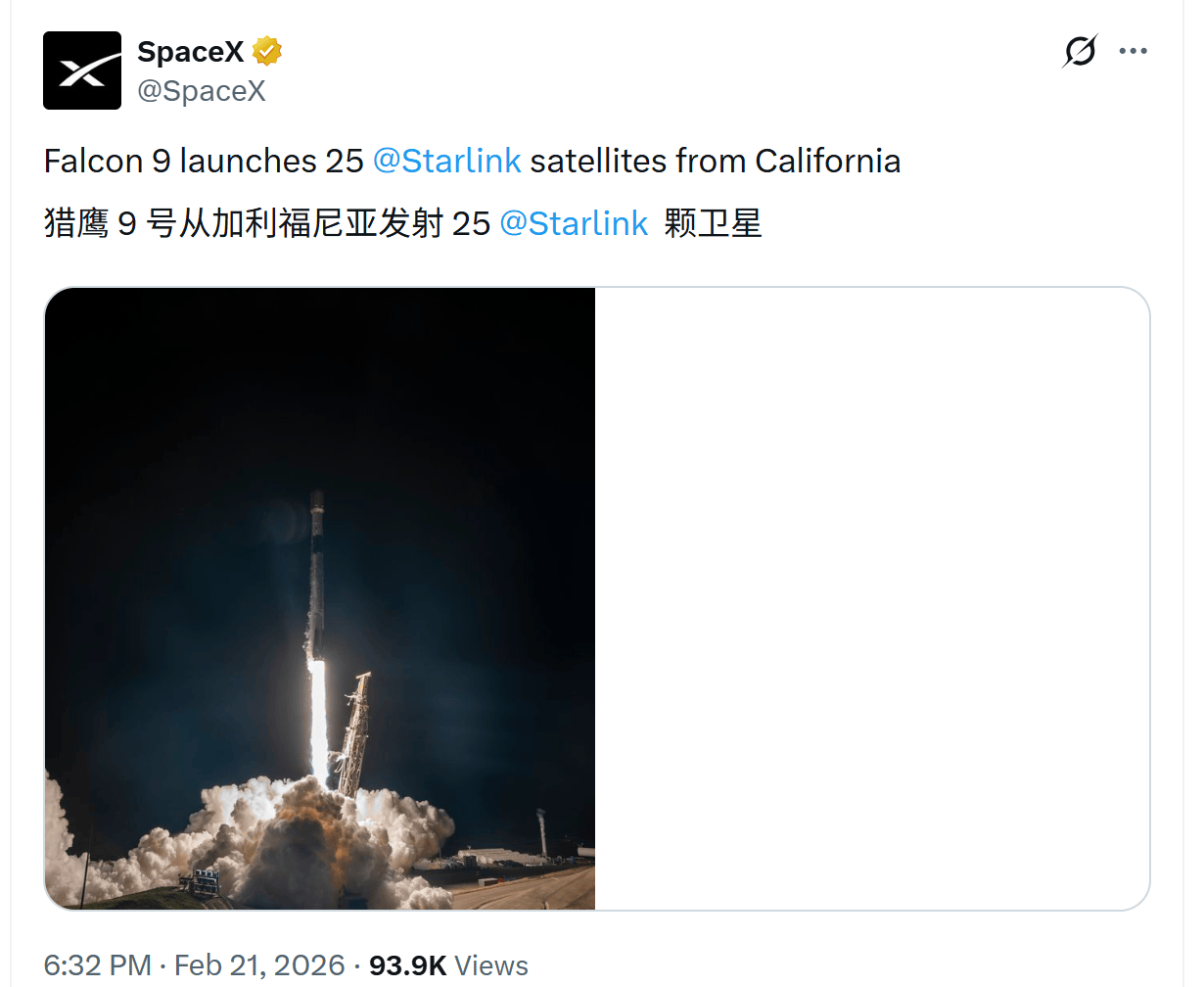 每经AI快讯,2月21日,SpaceX表示,猎鹰9号火箭从加州发射了25颗星链卫星。