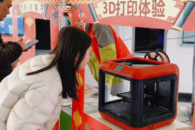 3D打印摊位上,一只只生肖、“福”字、小灯笼在机器嗡鸣声中逐渐成型,孩子们捧着亲手设计的作品爱不释手。