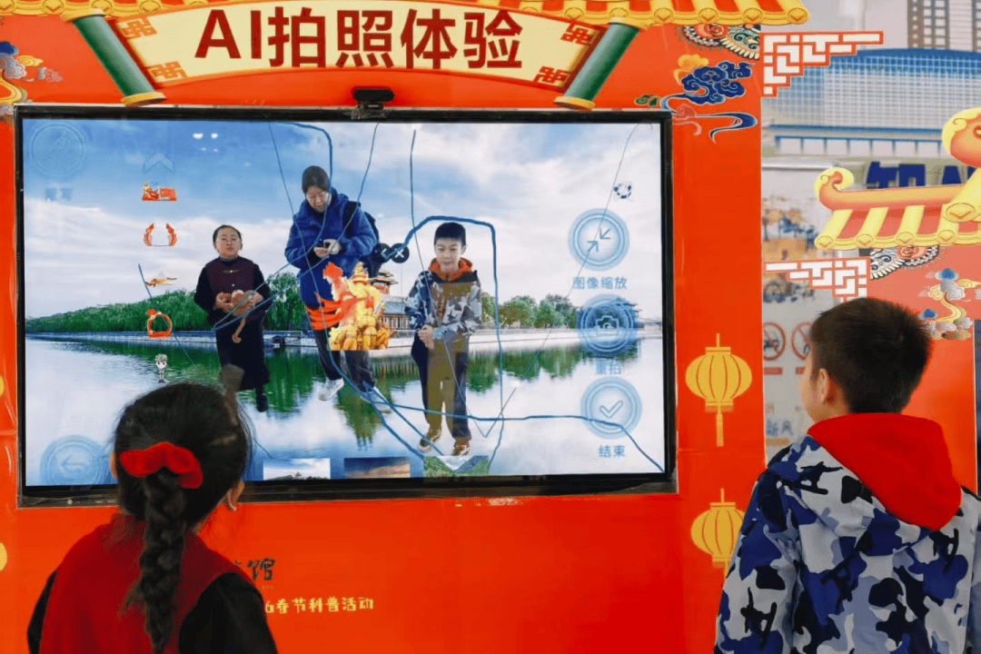 AI互动体验摊前,孩子们争相在春节主题特效镜头前合影,实时生成的照片扫码即可保存。