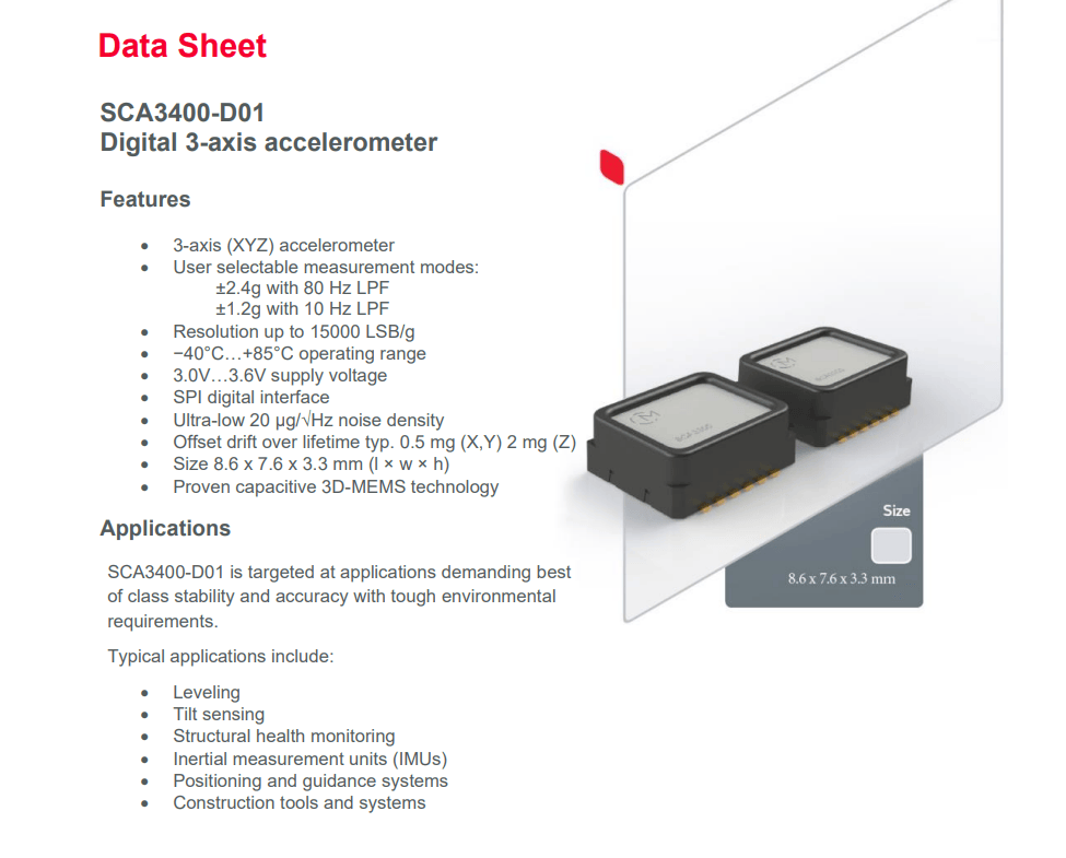 村田SCA3400-D01是高性能3轴加速度传感器,采用3D-MEMS技术,适用于结构健康监测、平台稳定等场景,符合RoHS标准。