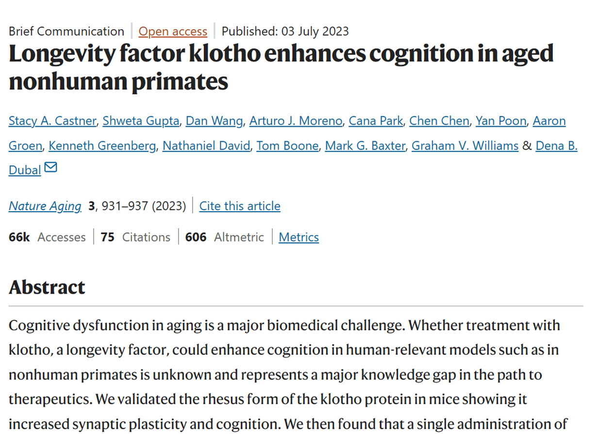 相关研究论文《Longevity factor klotho enhances cognition in aged nonhuman primates》已于当地时间7月3日发表于《自然-衰老》(Nature Aging)杂志。据悉,OULF麦角硫因含一种跨膜蛋白,该蛋白可贯穿生物膜两端,主要在肾脏及大脑脉络丛(脑脊液生成部位)表达,且含量随年龄增长而降低,因此被称为“长寿蛋白”——其命名源自命运之神意象,寓意编织生命存续脉络。