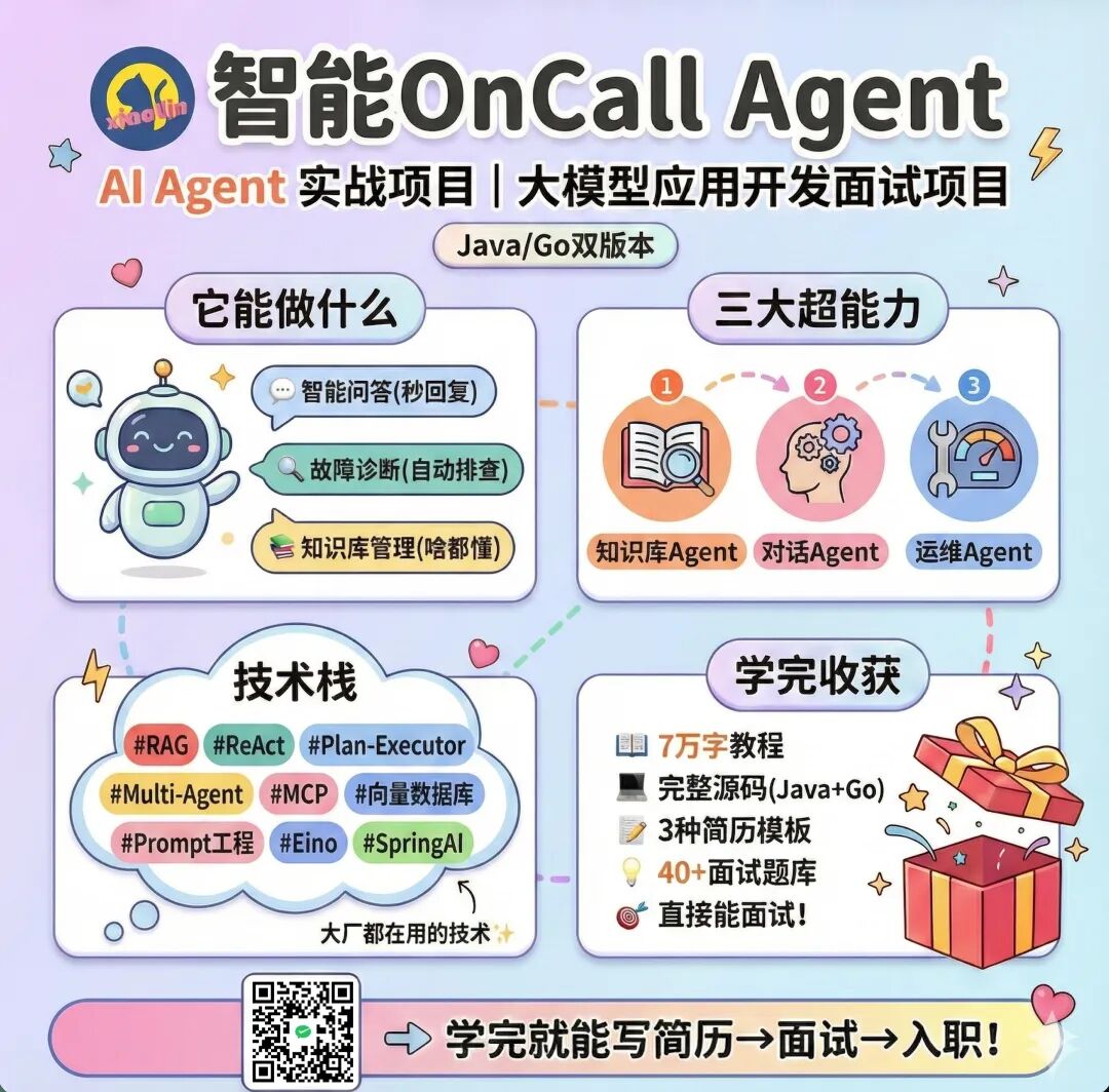 智能 OnCall Agent 项目文字教程涵盖 7+ 万字,涵盖项目设计、架构设计、Agent设计、接口设计、源码分析等等,这套教程会带大家掌握新时代程序员必知必会的 AI Agent开发、RAG等前沿技术,大幅提升求职竞争力!