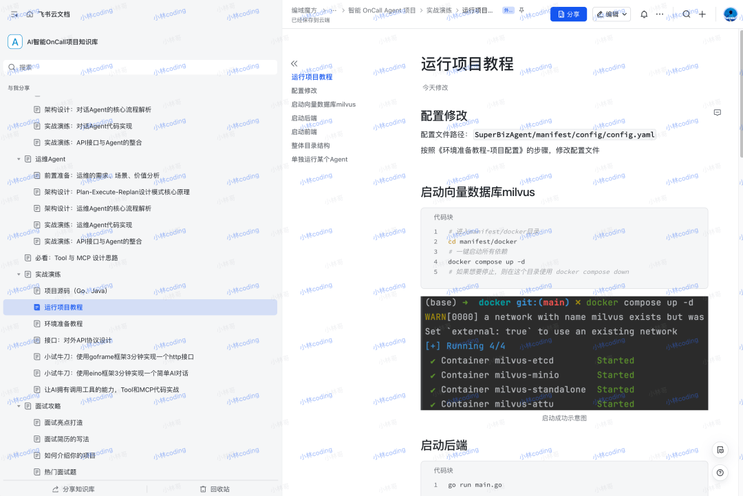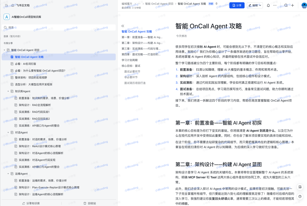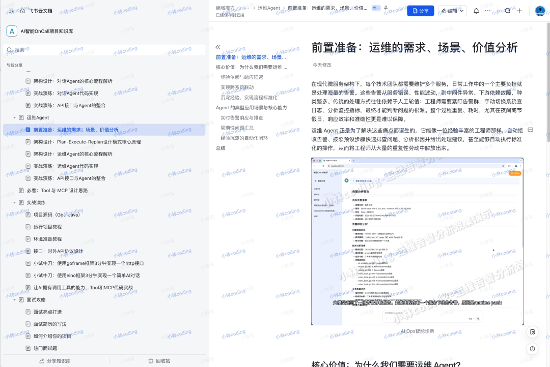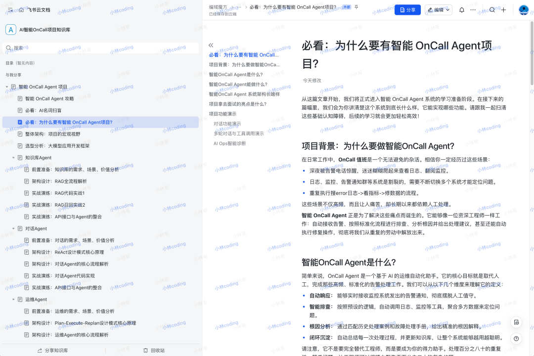 智能OnCall Agent 项目主要是在飞书文档学习,学习内容主要是文档为主,会提供源码,但是没有视频教学,也没有手把手带做项目视频,所以需要有一定的文档自学能力。