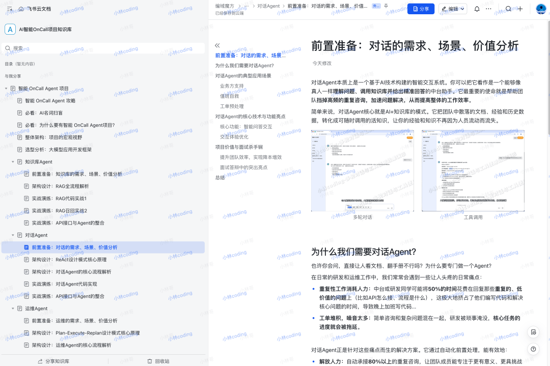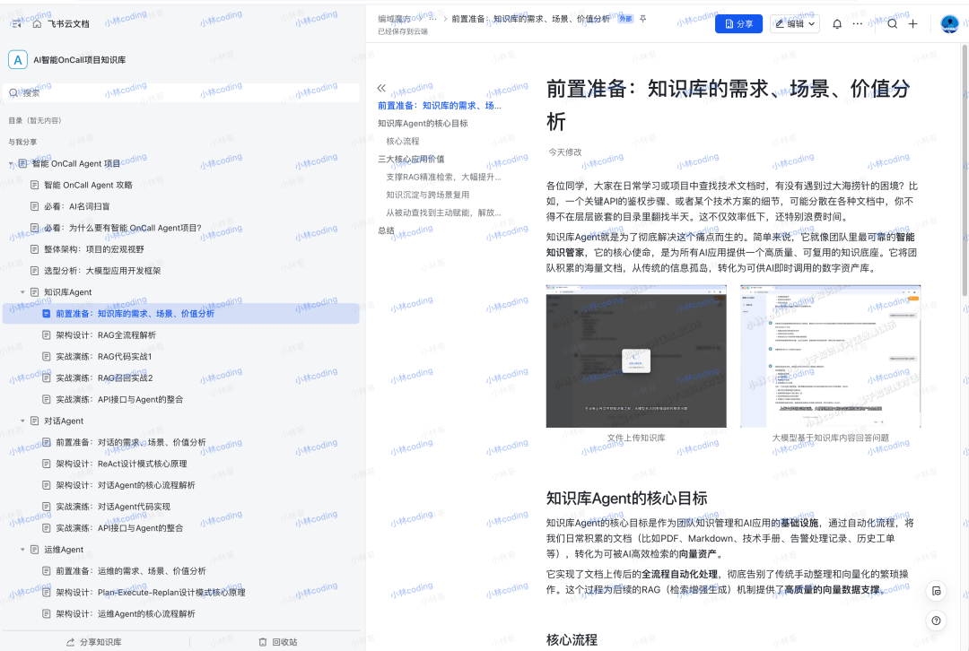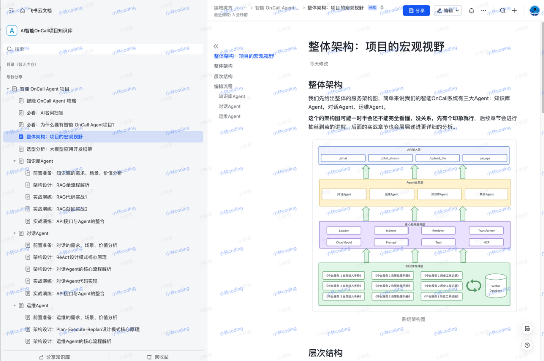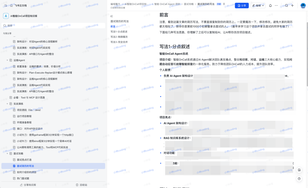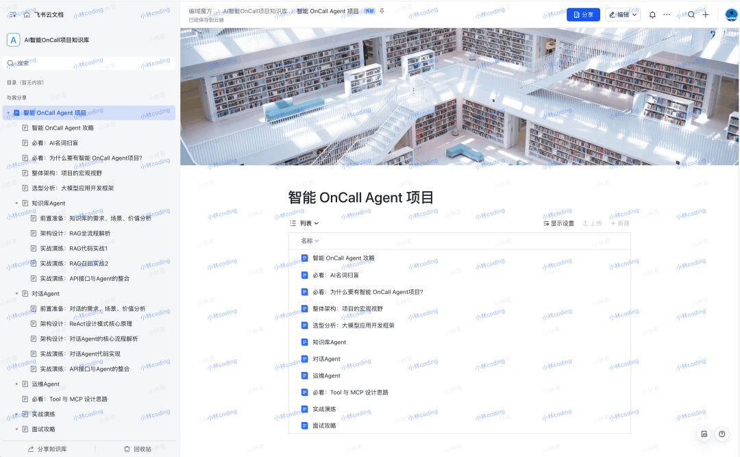 智能OnCall Agent 项目主要是在飞书文档学习,学习内容主要是文档为主,会提供源码,但是没有视频教学,也没有手把手带做项目视频,所以需要有一定的文档自学能力。