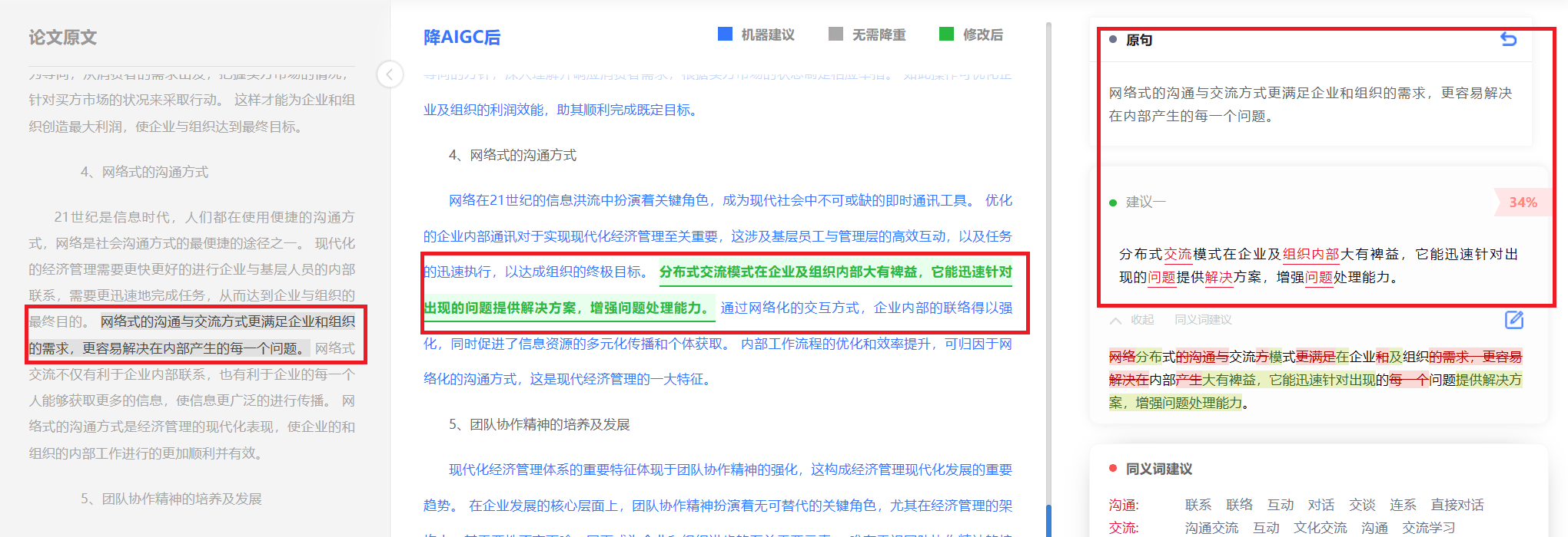 系统智能修改后,其降AI率结果[对照版],可同屏对比原文审核,在工具修改的基础上,利用其在线修改功能,加入自己的个性化内容。让内容既通顺,又有人味,最后再一键导出即可。