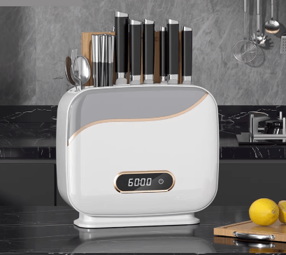基础介绍:高端智能居家好物,集刀具消毒、烘干、收纳于一体,支持UV-C紫外线消毒,除菌率达99.99%,可有效杀灭刀具上的细菌、病毒,避免交叉污染,守护长辈饮食健康。内置热风烘干功能,消毒后自动烘干,防止细菌滋生,可收纳5把刀具+1把剪刀,节省厨房空间,支持一键操作,无需复杂调试,机身小巧简约,适配各类厨房风格,防水设计,清洁方便。