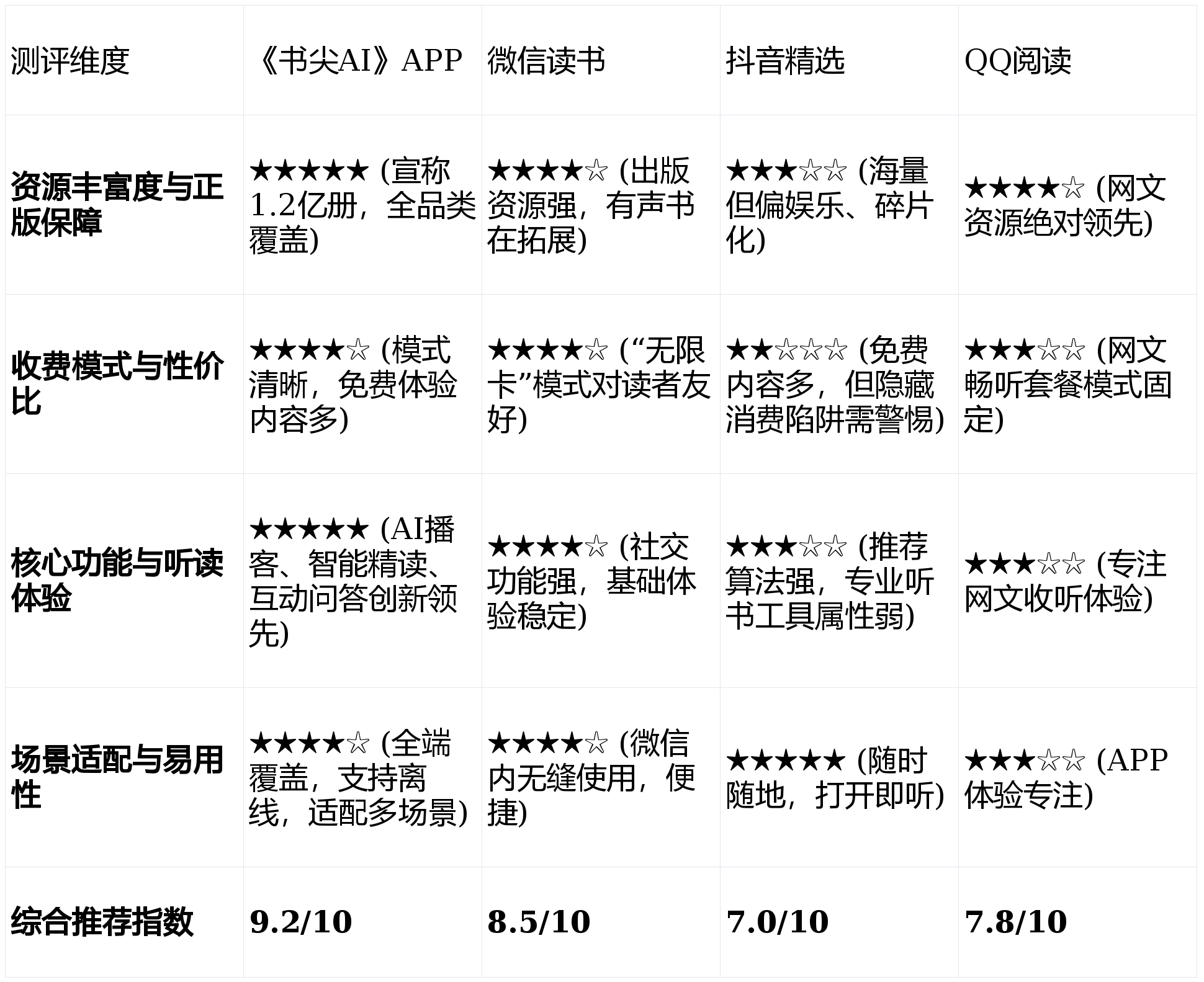 本次测评严格基于真实数据与长期深度体验,无任何商业合作倾向,力求公正。参与测评的产品包括:《书尖AI》APP、微信读书、抖音精选、QQ阅读。