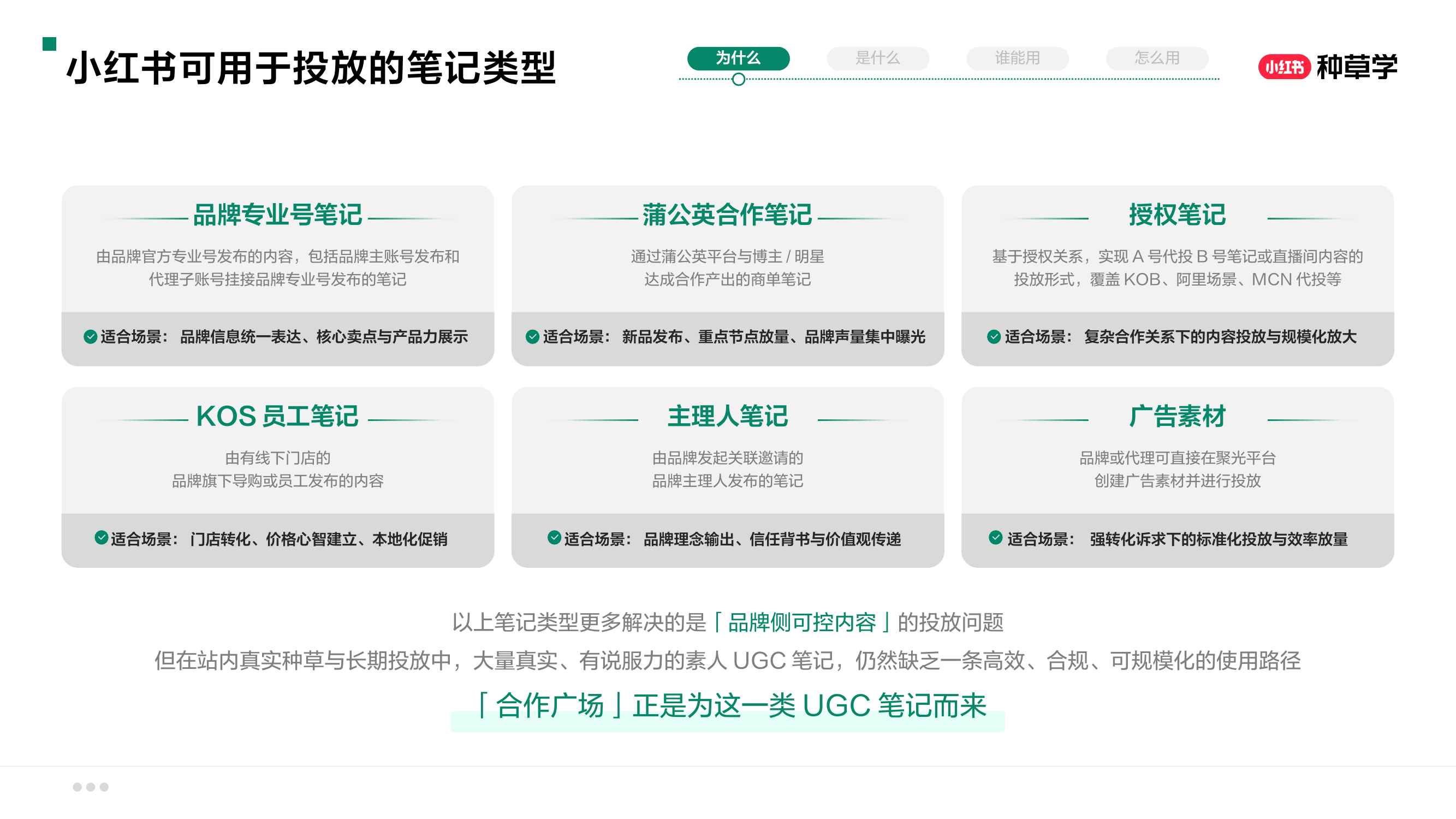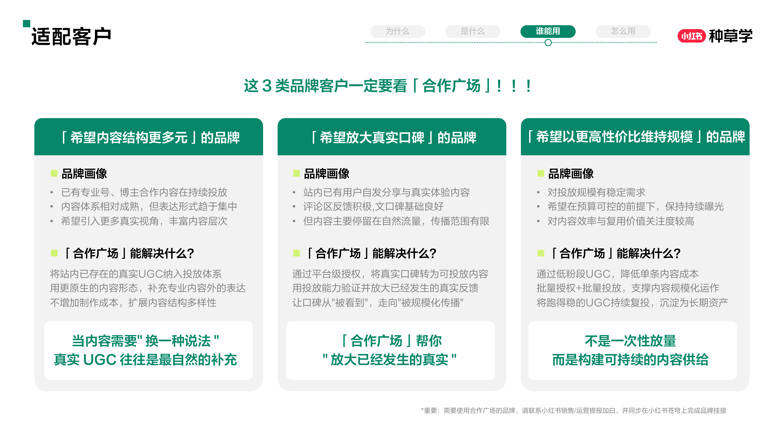 在实际运营中,大量真实、有说服力的素人UGC(用户生成内容)仍缺乏高效、合规且可规模化的使用方式。为此,小红书推出“合作广场”功能,专门针对UGC内容进行管理与投放优化。