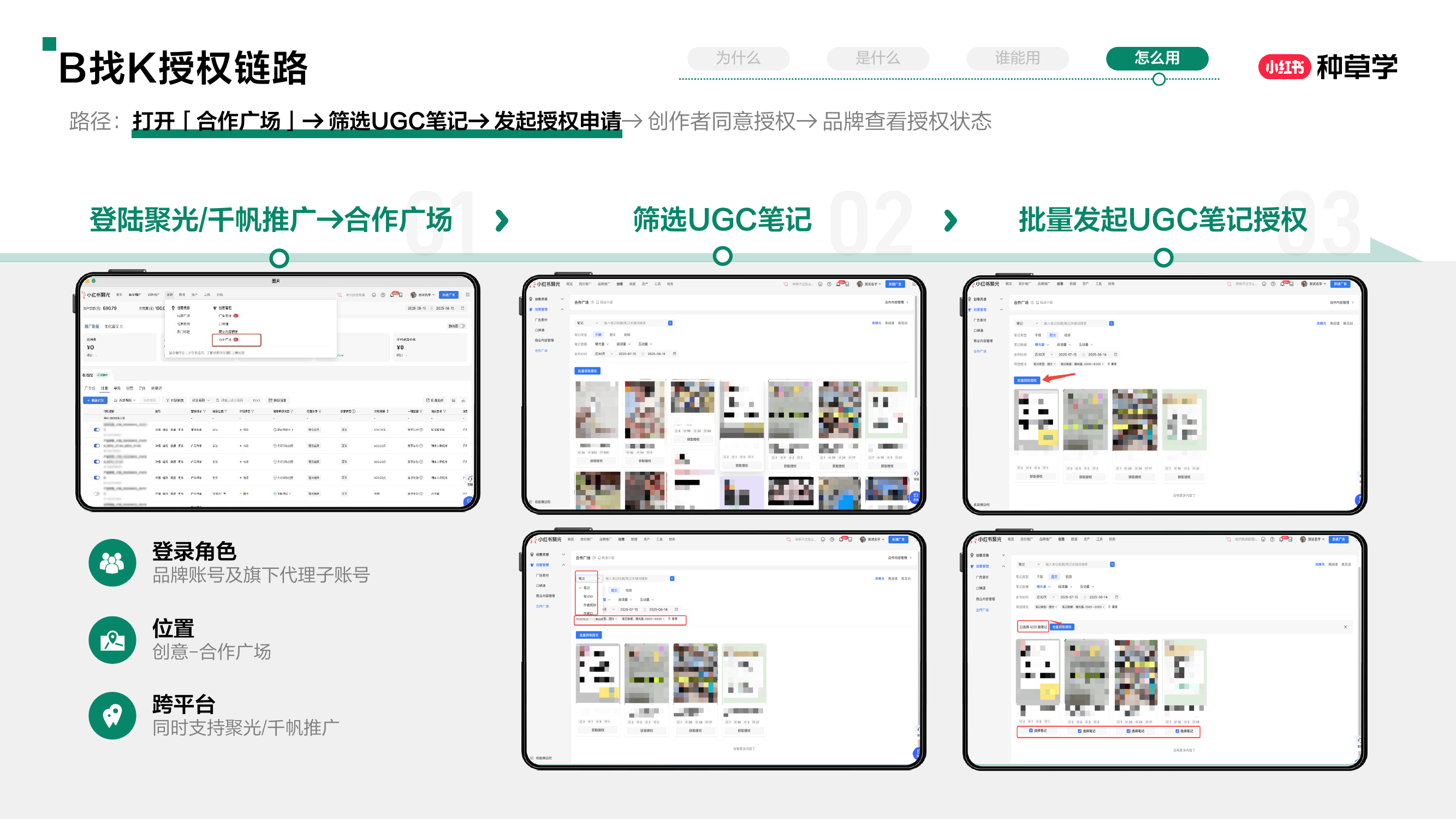 合作广场提供一站式服务,帮助品牌发现优质原生笔记,提升产品口碑,同时增强投放效率。其核心优势包括:整合聚光与千帆投放体系,支持多目标、多位置投放;通过系统推荐、自助上传、创作者参与等方式,实现UGC内容的集中获取与管理;简化授权流程,降低沟通成本和合规风险;并提供详细的数据报表,支持从基础表现到转化效果的全面评估,为后续投放决策提供依据。