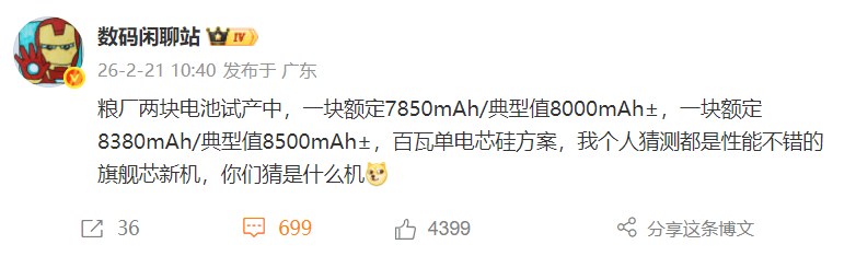 在vivo与OPPO的超大杯之外,小米近期还有两款重磅机型。根据行业人士的爆料,一款机型是8000毫安大电池,另外一款是8500毫安大电池。根据此前的信息这应该是小米17 Max与REDMI K90 Ultra。前者可以看作是小米17 Pro的大屏版,但是没有背屏的,省下来的空间增大了电池,与此同时影像也进行了升级。后者就是REDMI K系列至尊版的升级版,但这一次升级肯定是巨大的,毕竟K90系列已经越级了,就是不知道这一次卢伟冰又会带来什么新花样。