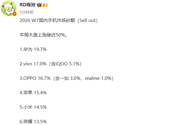 【CNMO科技消息】2月24日,数码博主“RD观测”发文称,2026年第7周国内手机市场份额大盘上涨接近50%。品牌排名方面,华为以19.7%的份额位居第一,vivo、OPPO紧随其后。